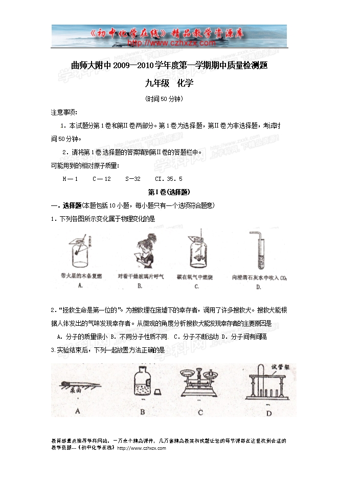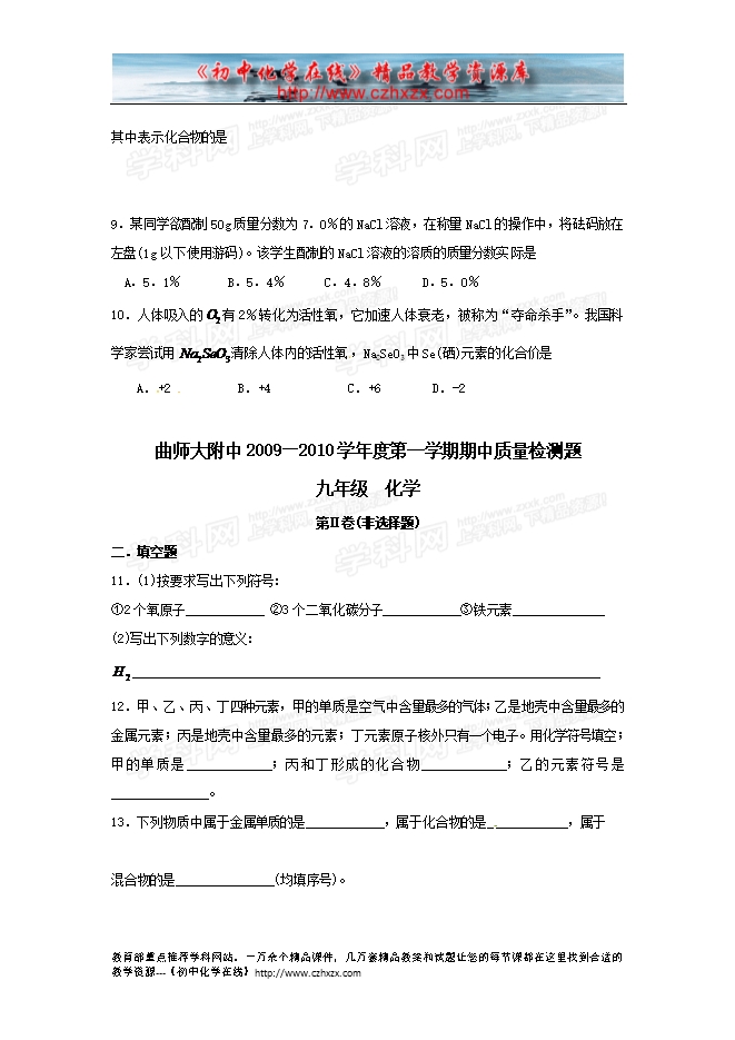 曲师大附中2009—2010学年度第一学期期中质量检测题及答案