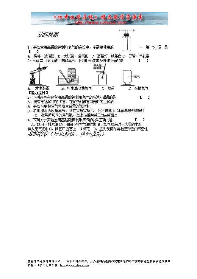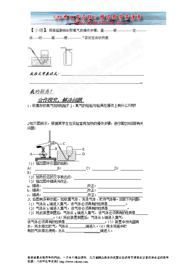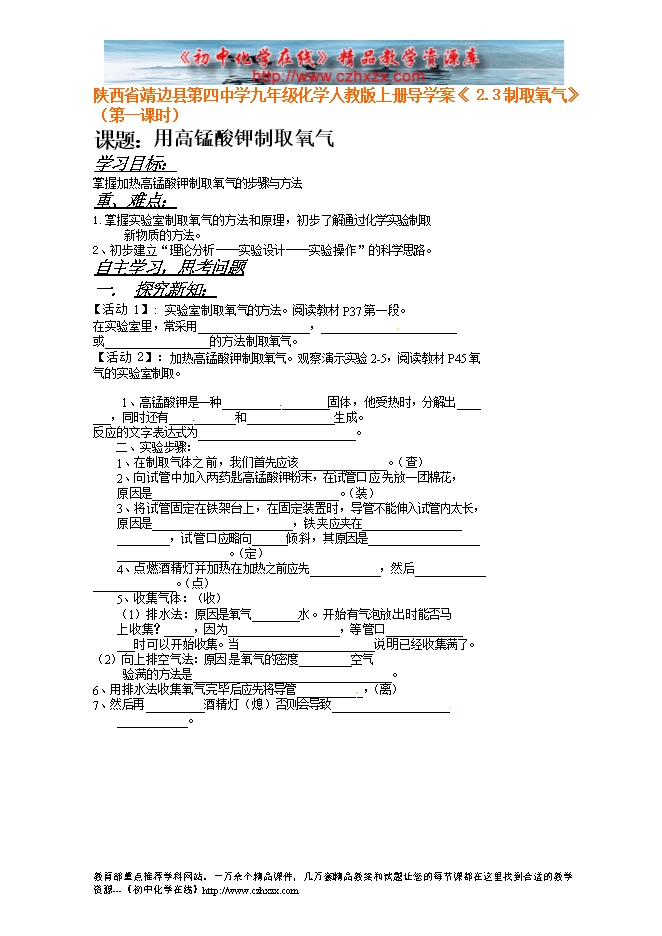 陕西省靖边县第四中学九年级化学人教版上册导学案《 2.3制取氧气》(第一课时)