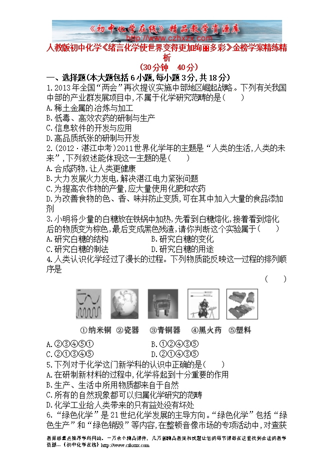 人教版初中化学《绪言化学使世界变得更加绚丽多彩》金榜学案精练精析