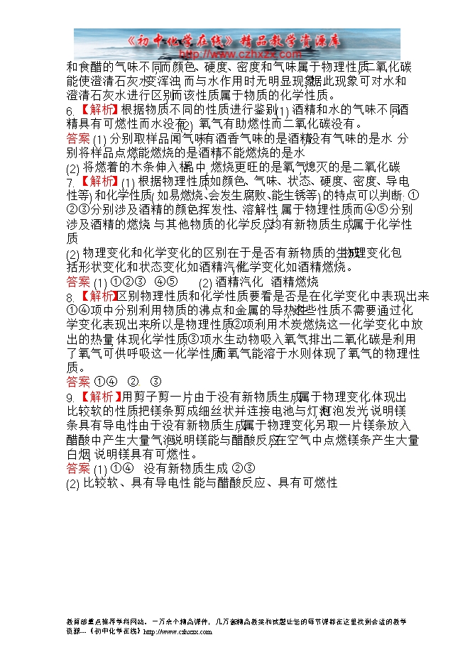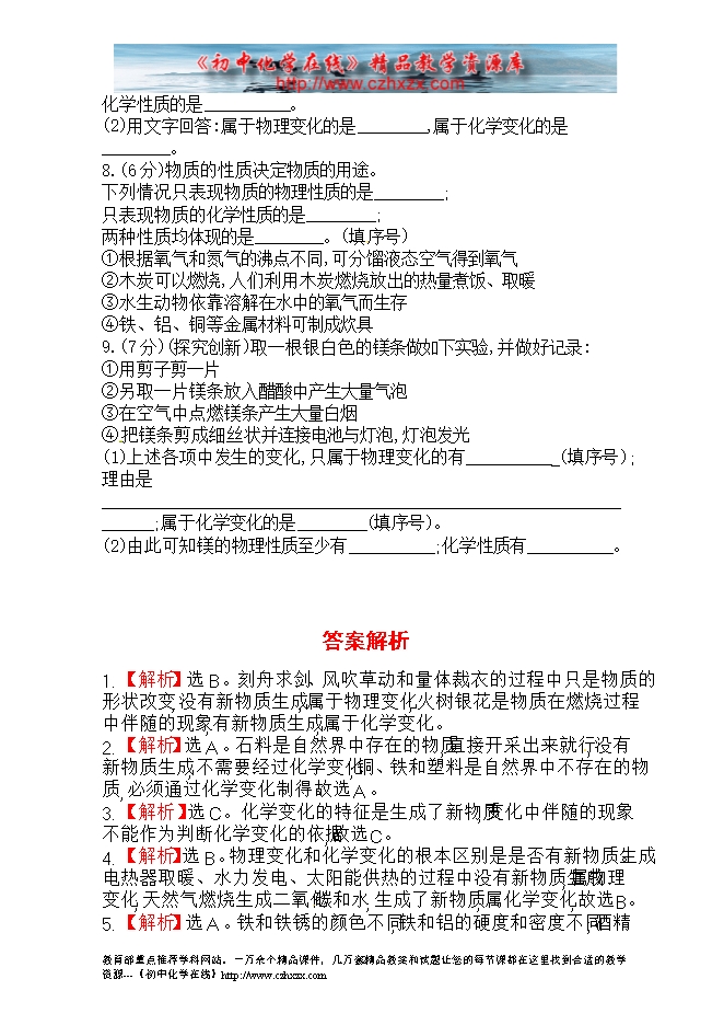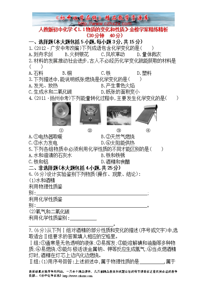 人教版初中化学《1.1物质的变化和性质》金榜学案精练精析