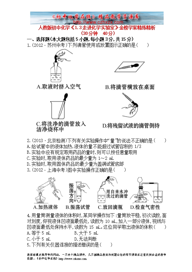 人教版初中化学《1.3走进化学实验室》金榜学案精练精析