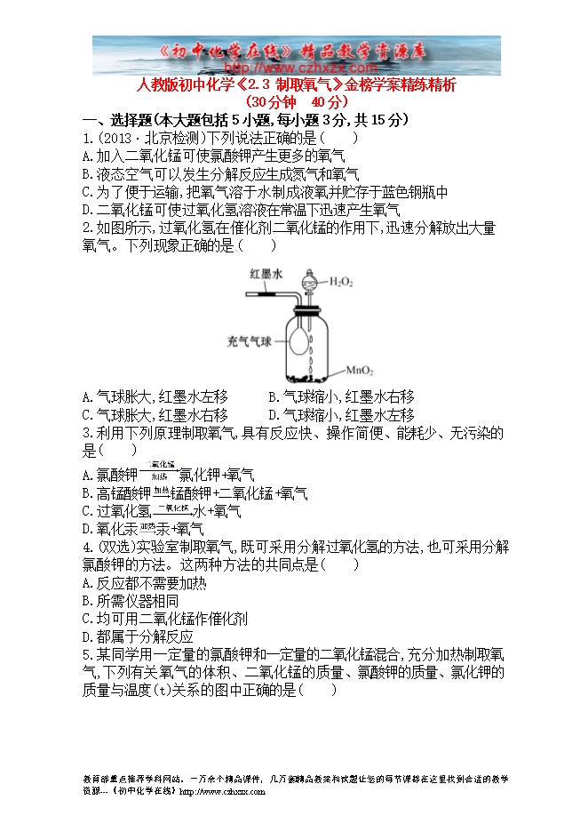 人教版初中化学《2.3制取氧气》金榜学案精练精析