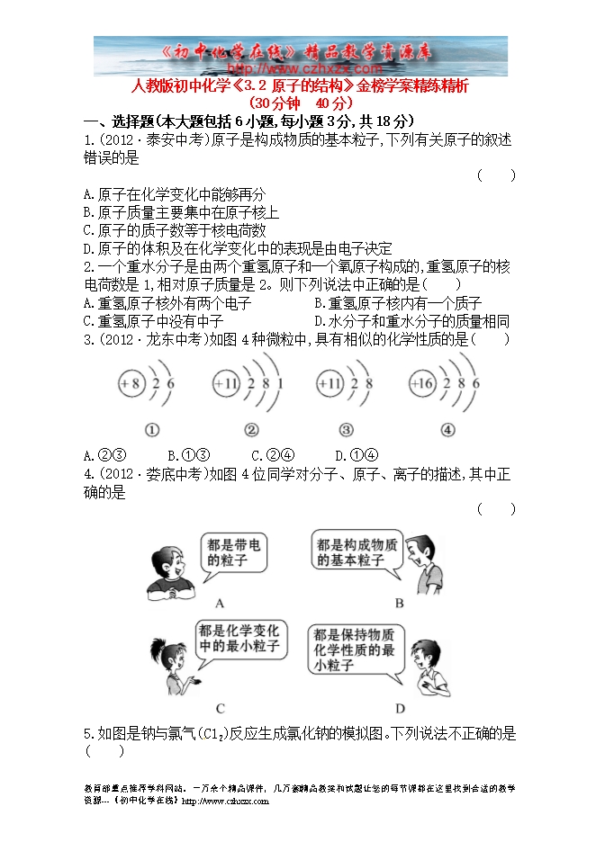 人教版初中化学《3.2原子的结构》金榜学案精练精析