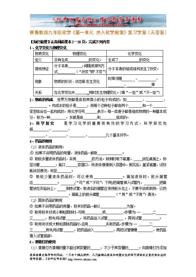 新鲁教版九年级化学《第一单元 步入化学殿堂》复习学案(无答案)
