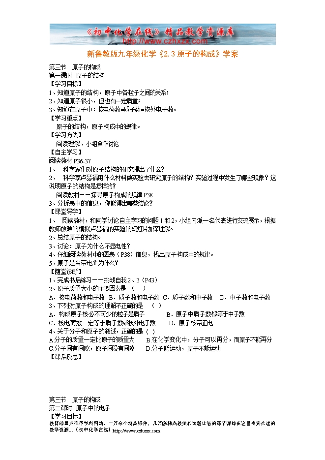 新鲁教版九年级化学《2.3原子的构成》学案