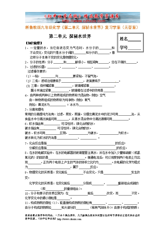 新鲁教版九年级化学《第二单元 探秘水世界》复习学案(无答案)