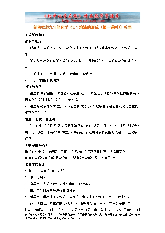 新鲁教版九年级化学《3.1溶液的形成(第一课时)》教案