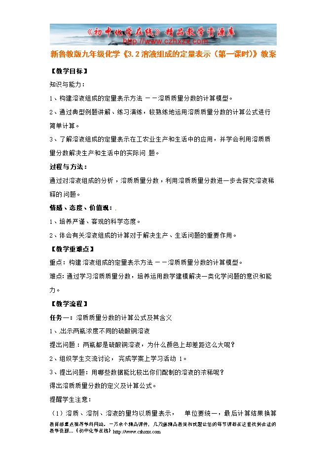新鲁教版九年级化学《3.2溶液组成的定量表示(第一课时)》教案