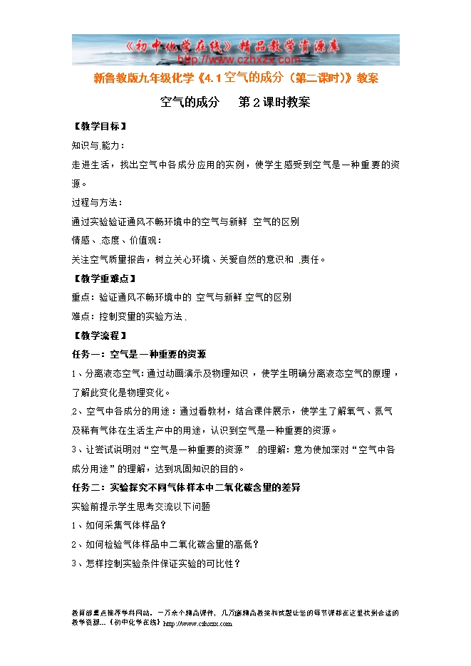 新鲁教版九年级化学《4.1空气的成分(第二课时)》教案