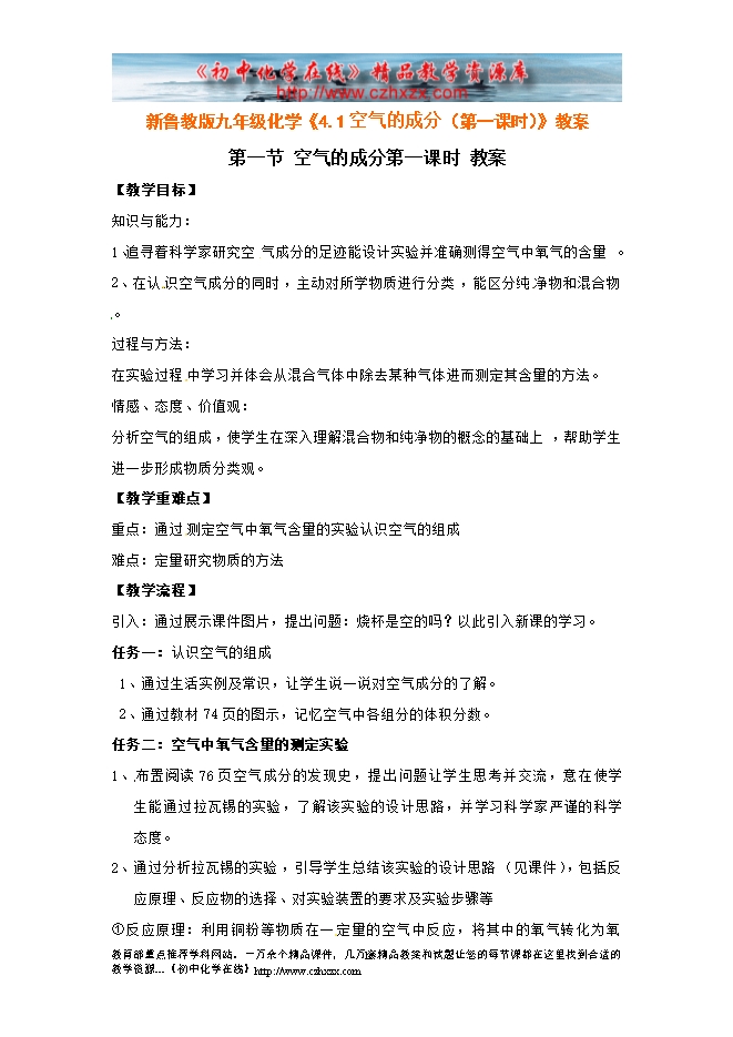 新鲁教版九年级化学《4.1空气的成分(第一课时)》教案