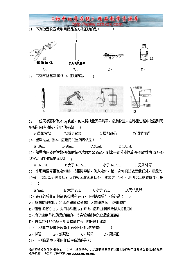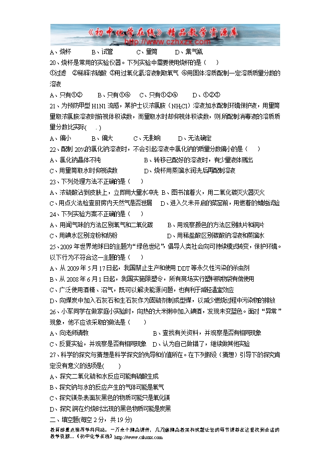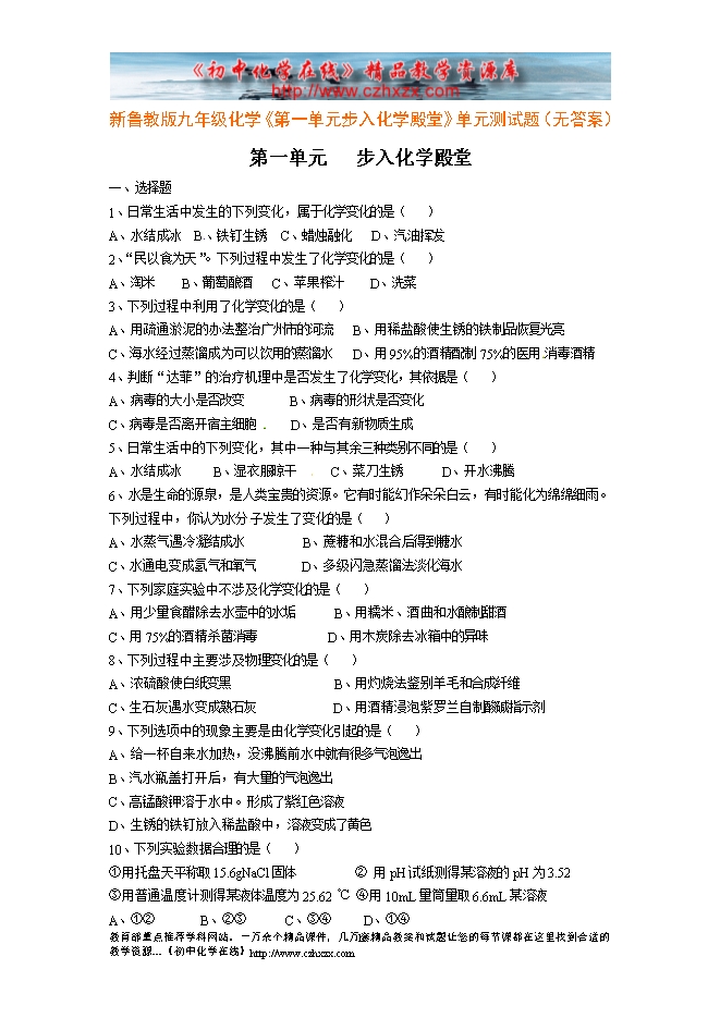 新鲁教版九年级化学《第一单元步入化学殿堂》单元测试题(无答案)