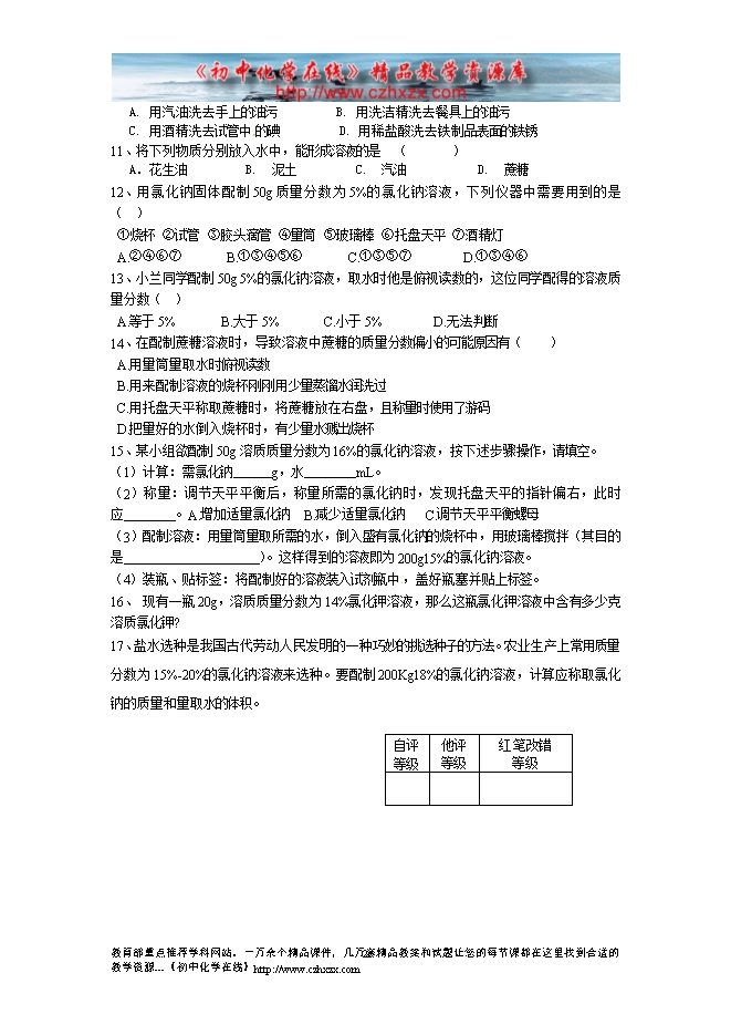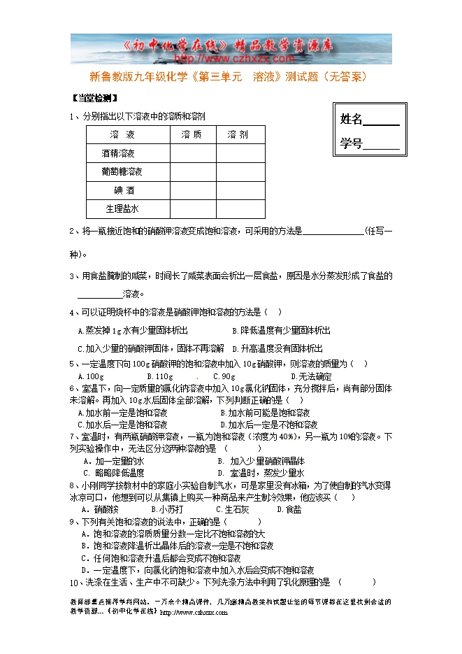 新鲁教版九年级化学《第三单元 溶液》测试题(无答案)