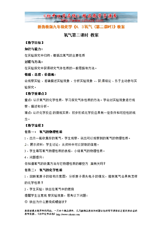 - 上一份资料:新鲁教版九年级化学《4.3氧气(第一课时)》教案
