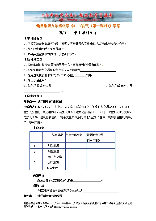 新鲁教版九年级化学《4.3氧气(第一课时)》学案