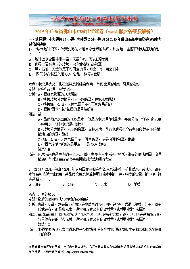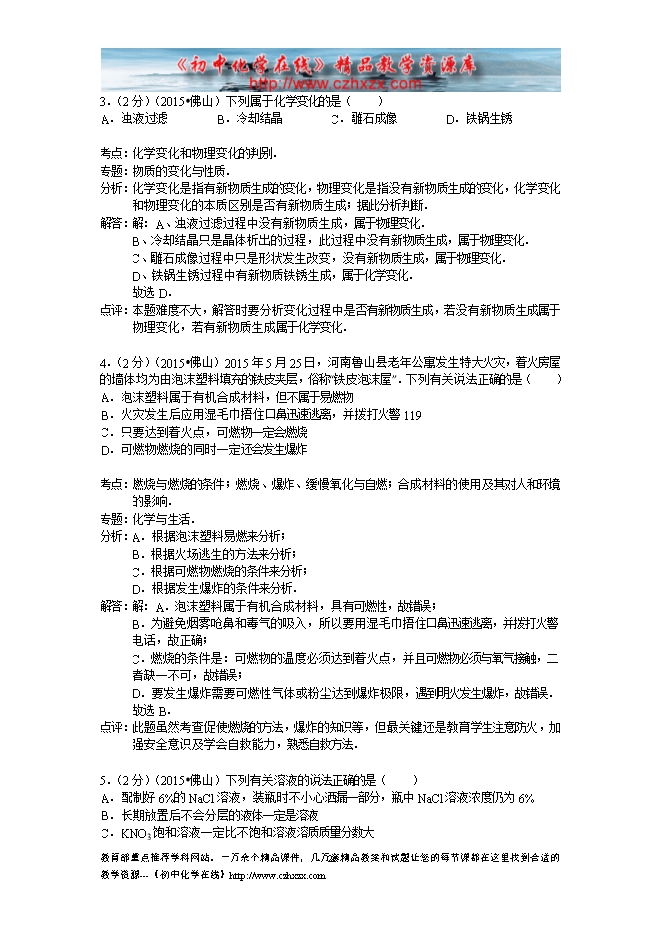 2015年广东省佛山市中考化学试卷(word版含答案及解析)