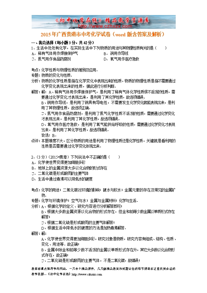 2015年广西贵港市中考化学试卷(word版含答案及解析)