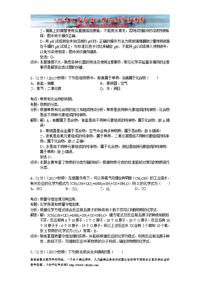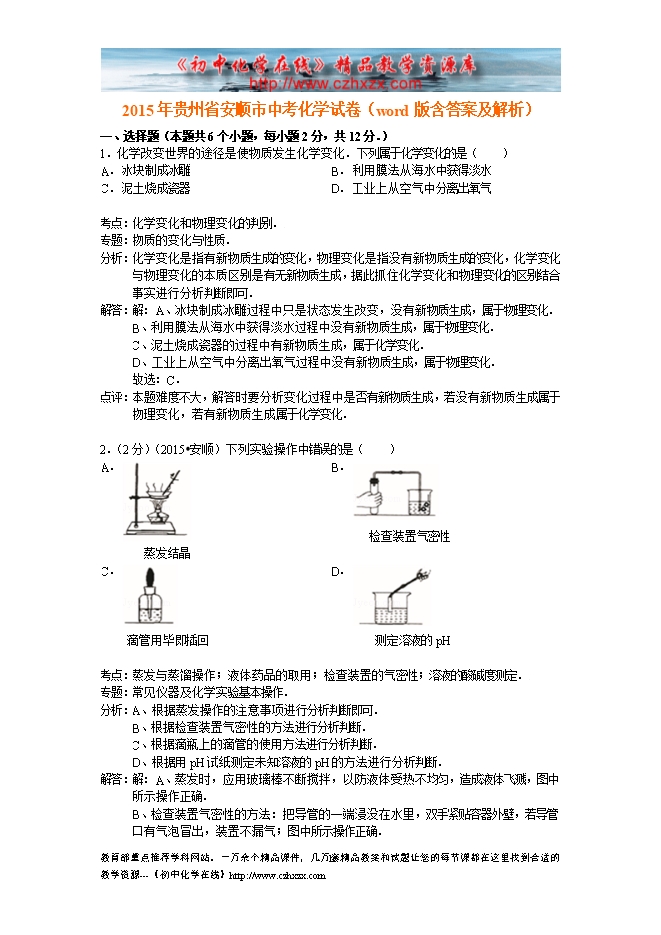 2015年贵州省安顺市中考化学试卷(word版含答案及解析)