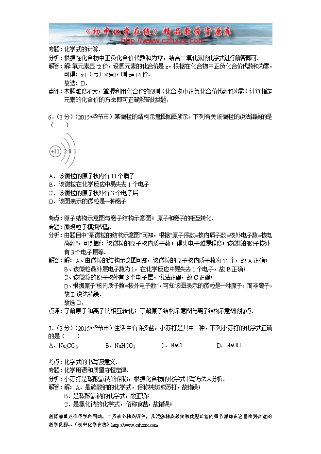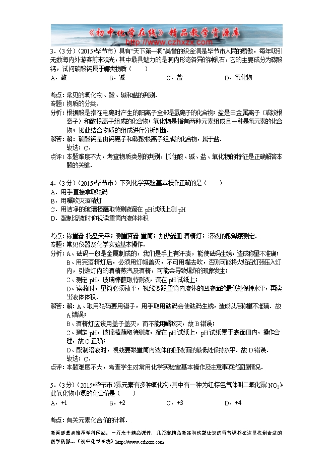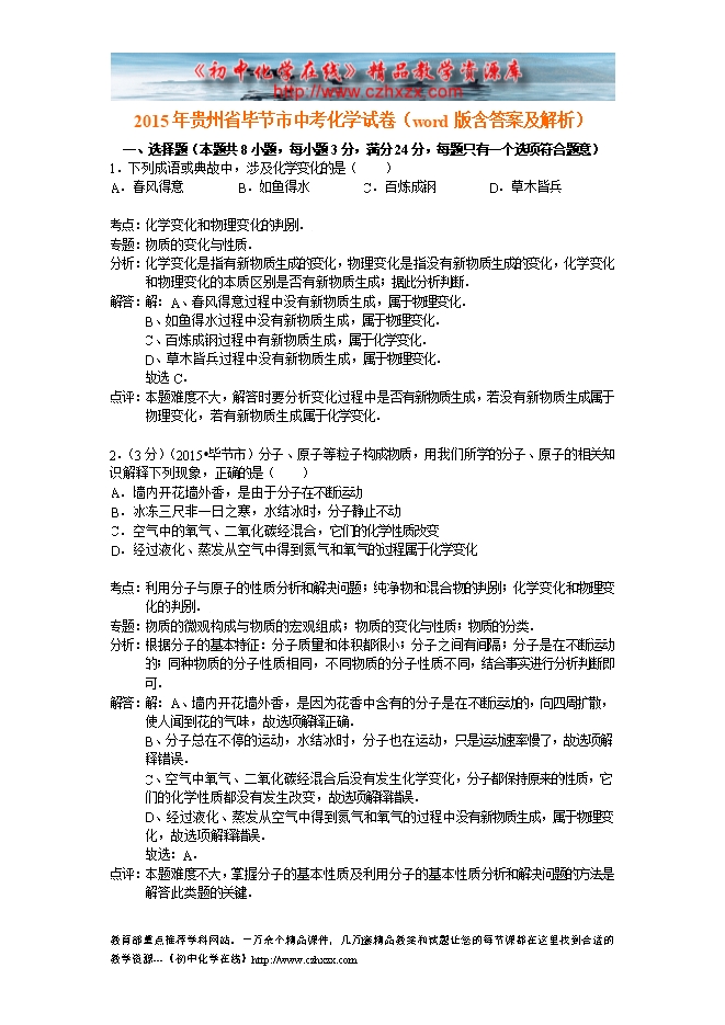2015年贵州省毕节市中考化学试卷(word版含答案及解析)
