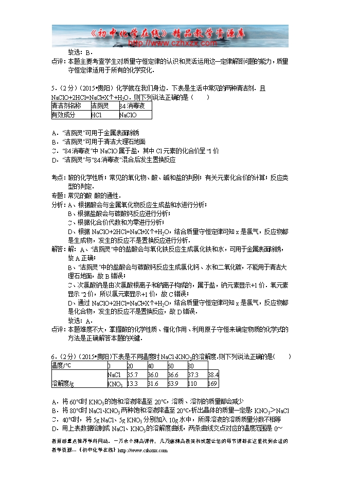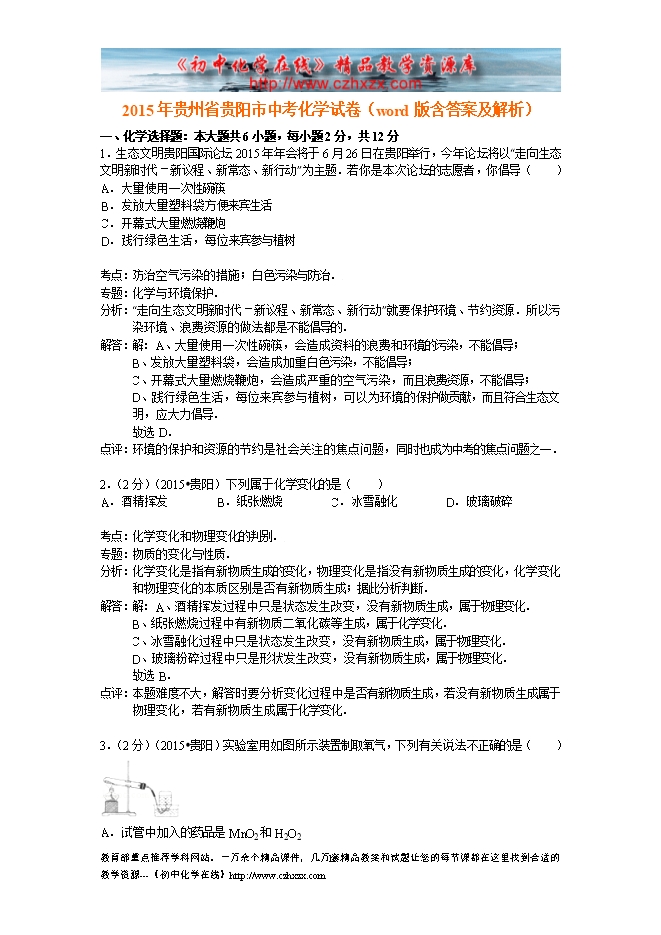 2015年贵州省贵阳市中考化学试卷(word版含答案及解析)
