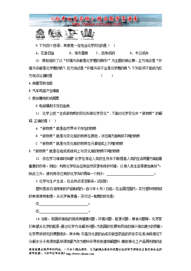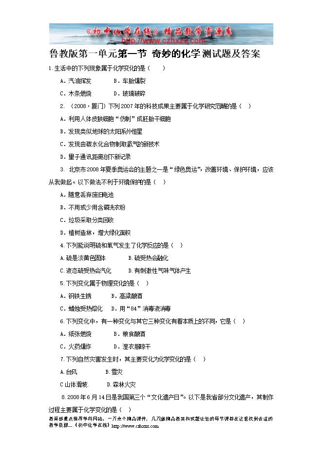 鲁教版《第一单元第一节 化学真奇妙》测试题及答案