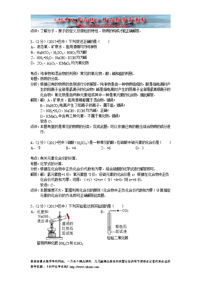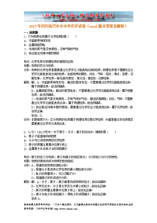 2015年四川省巴中市中考化学试卷(word版含答案及解析)