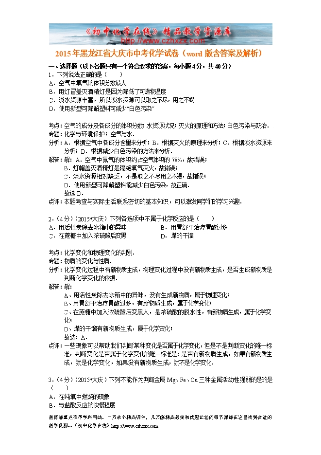 2015年黑龙江省大庆市中考化学试卷(word版含答案及解析)