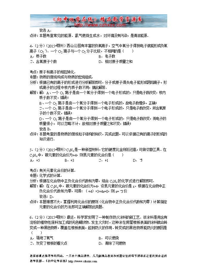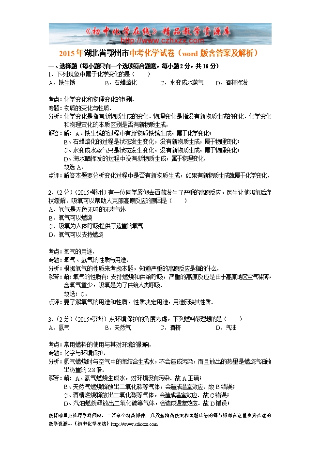 2015年湖北省鄂州市中考化学试卷(word版含答案及解析)