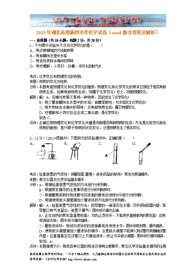 2015年湖北省恩施州中考化学试卷(word版含答案及解析)