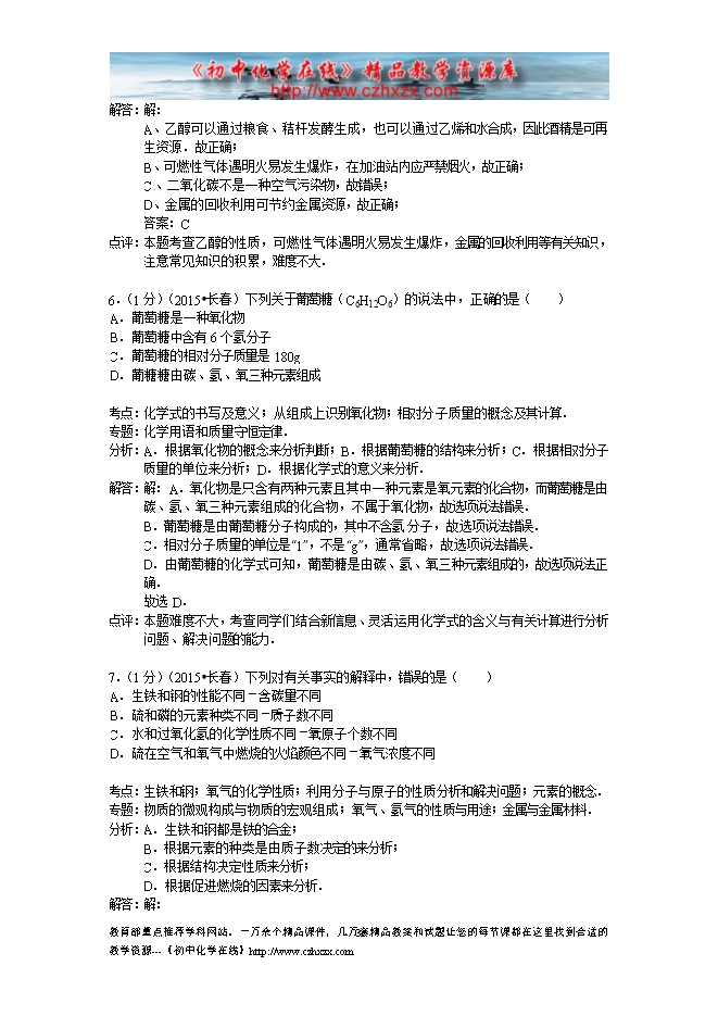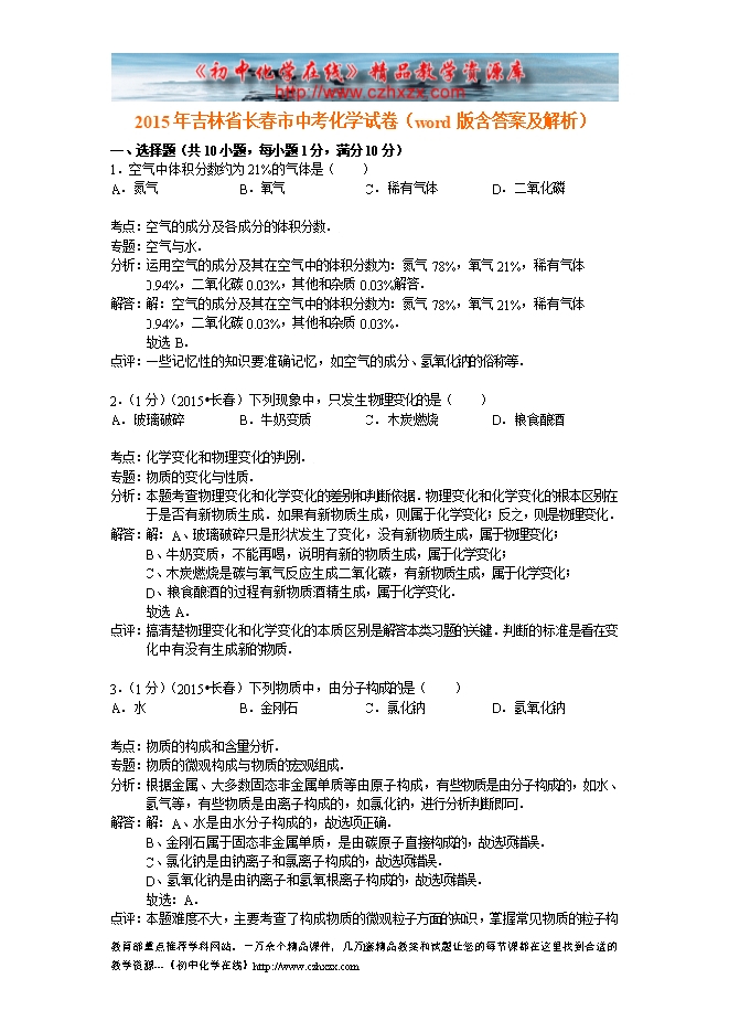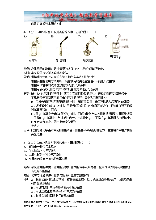 2015年吉林省长春市中考化学试卷(word版含答案及解析)