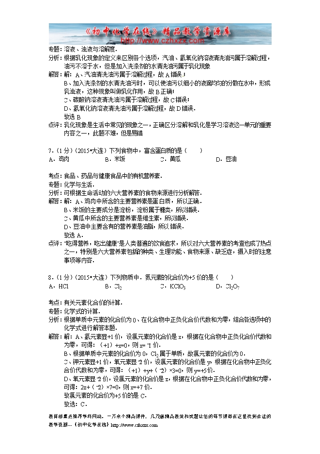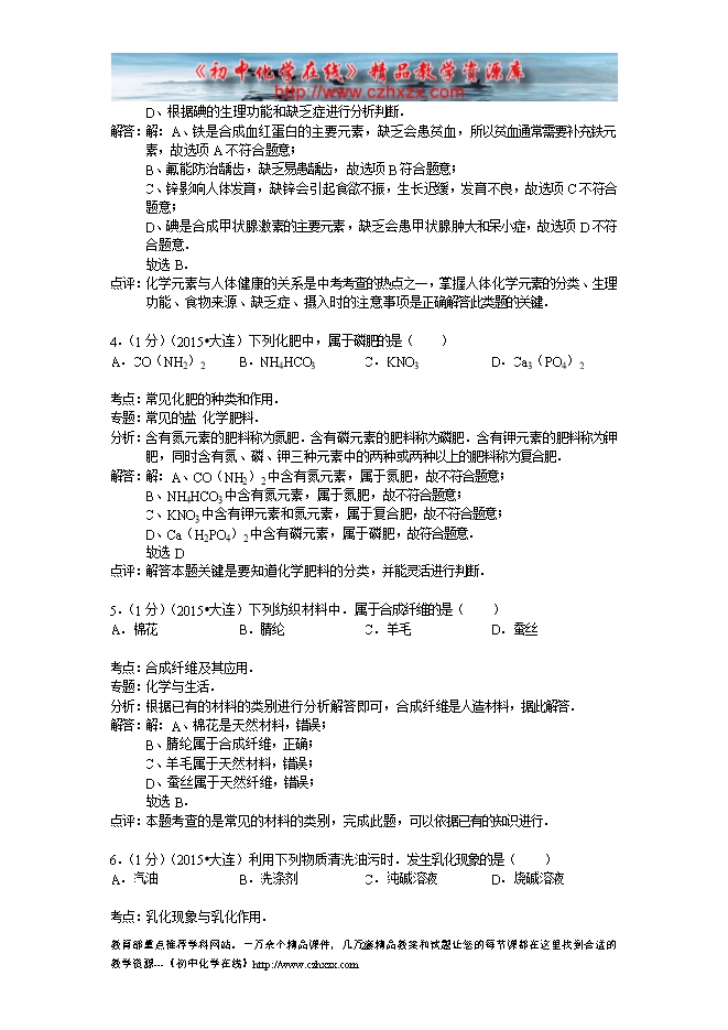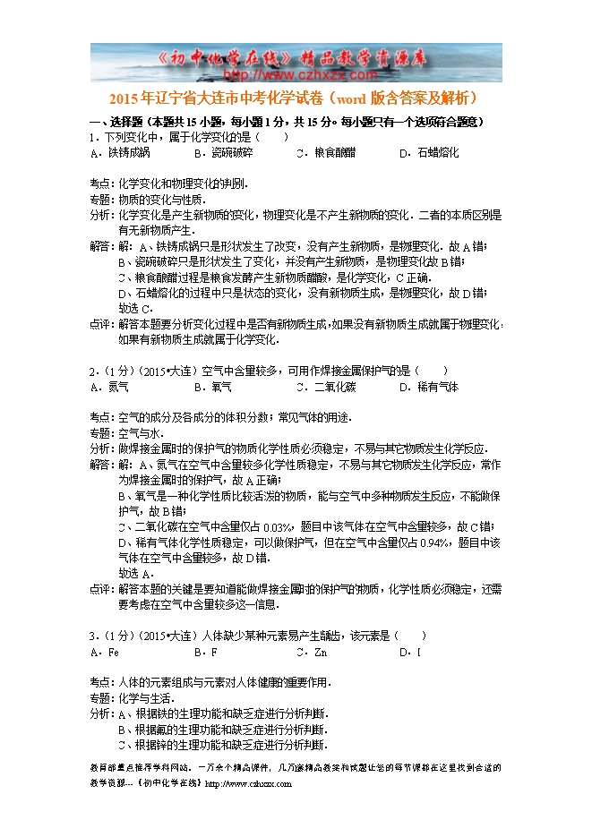 2015年辽宁省大连市中考化学试卷(word版含答案及解析)