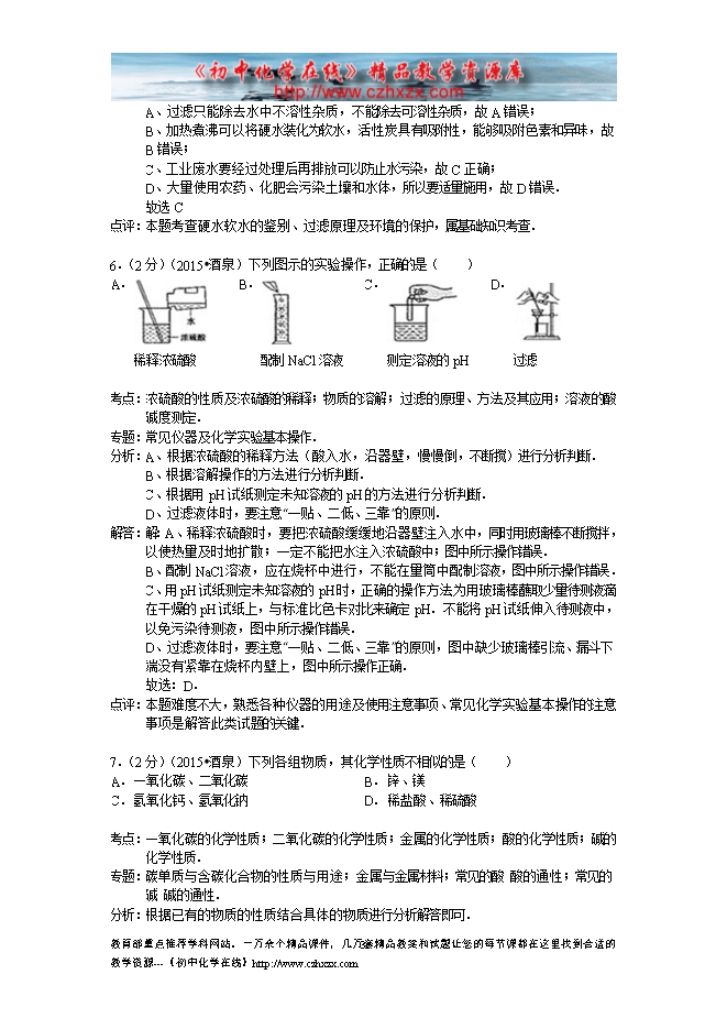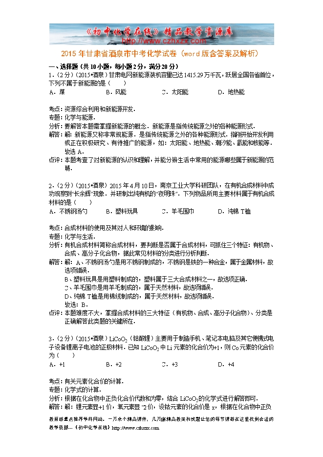 2015年甘肃省酒泉市中考化学试卷(word版含答案及解析)