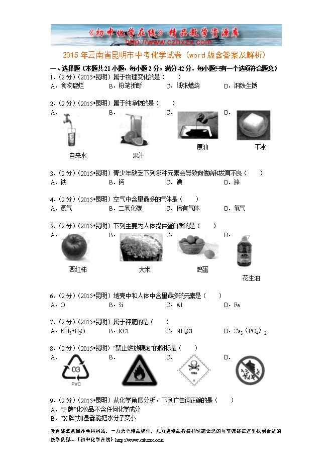 2015年云南省昆明市中考化学试卷(word版含答案及解析)