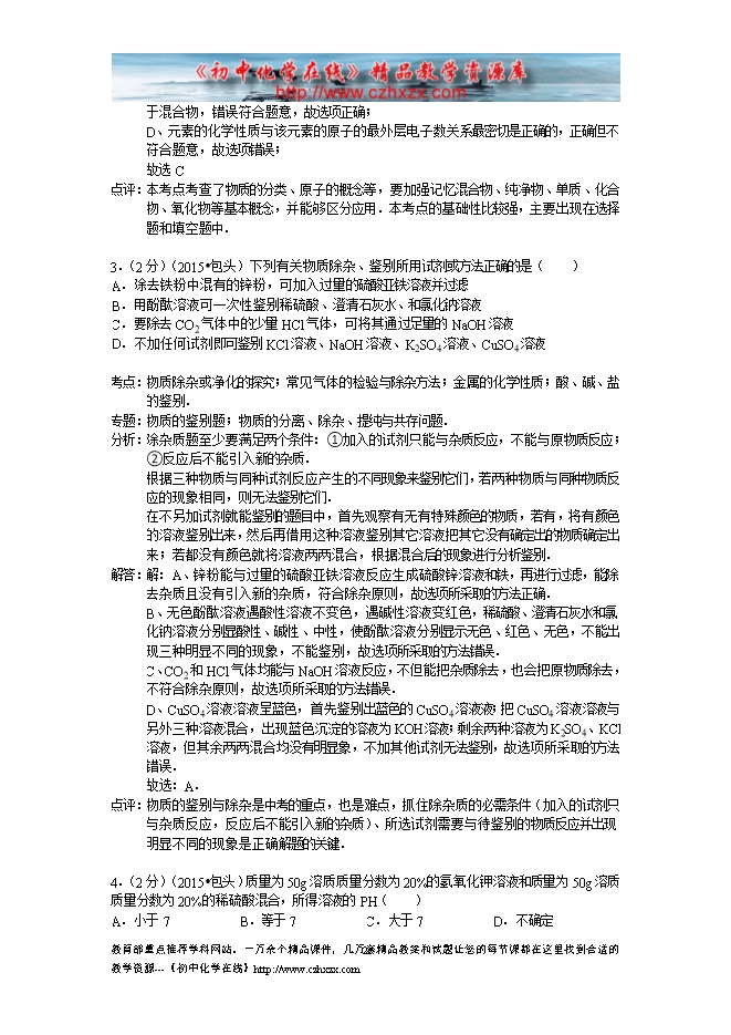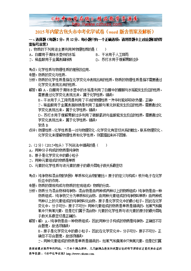 2015年内蒙古包头市中考化学试卷(word版含答案及解析)