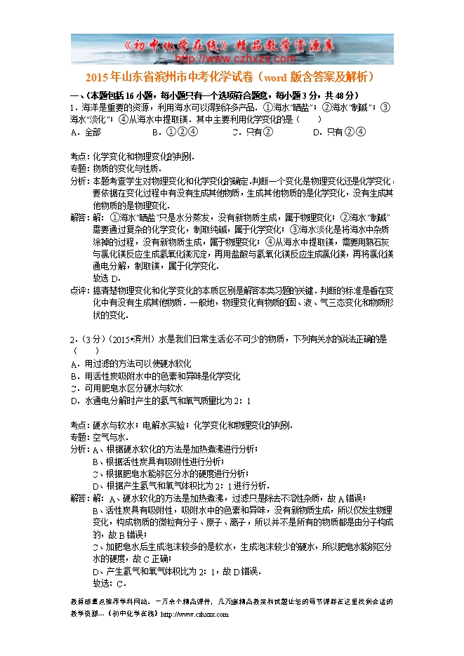 2015年山东省滨州市中考化学试卷(word版含答案及解析)