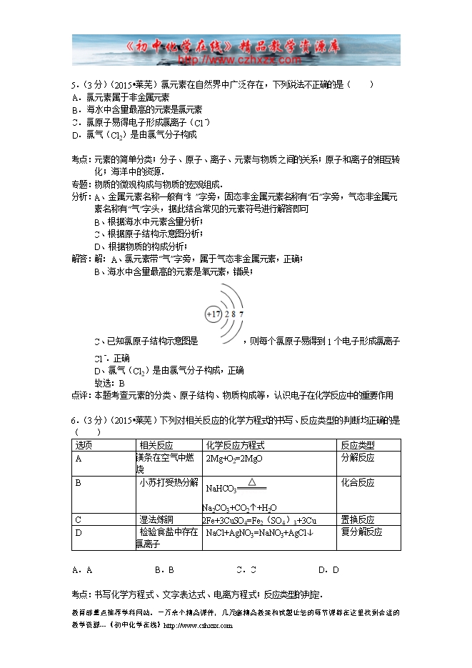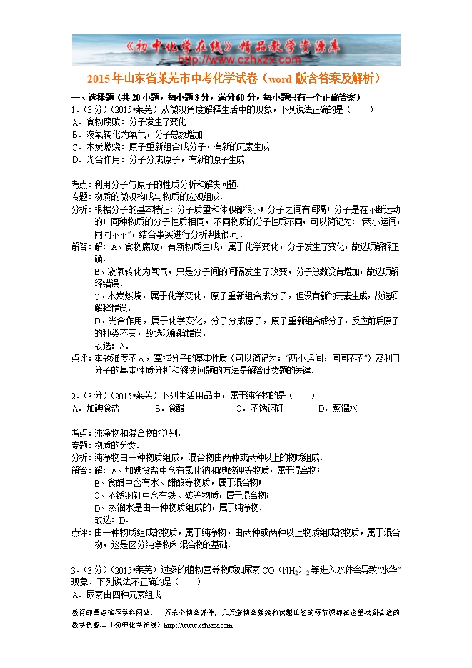 2015年山东省莱芜市中考化学试卷(word版含答案及解析)