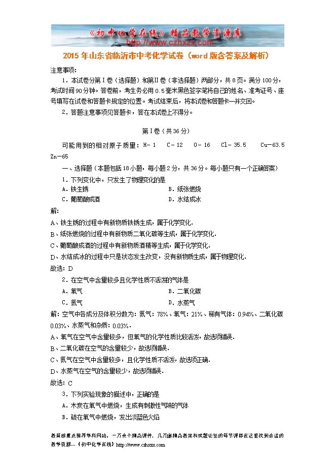 2015年山东省临沂市中考化学试卷(word版含答案及解析)