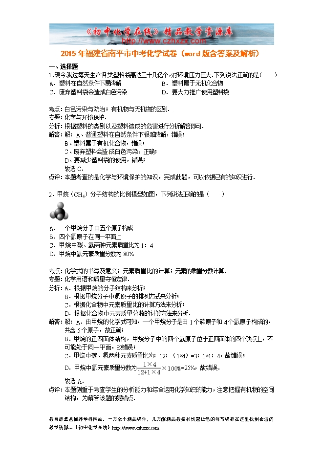 2015年福建省南平市中考化学试卷(word版含答案及解析)