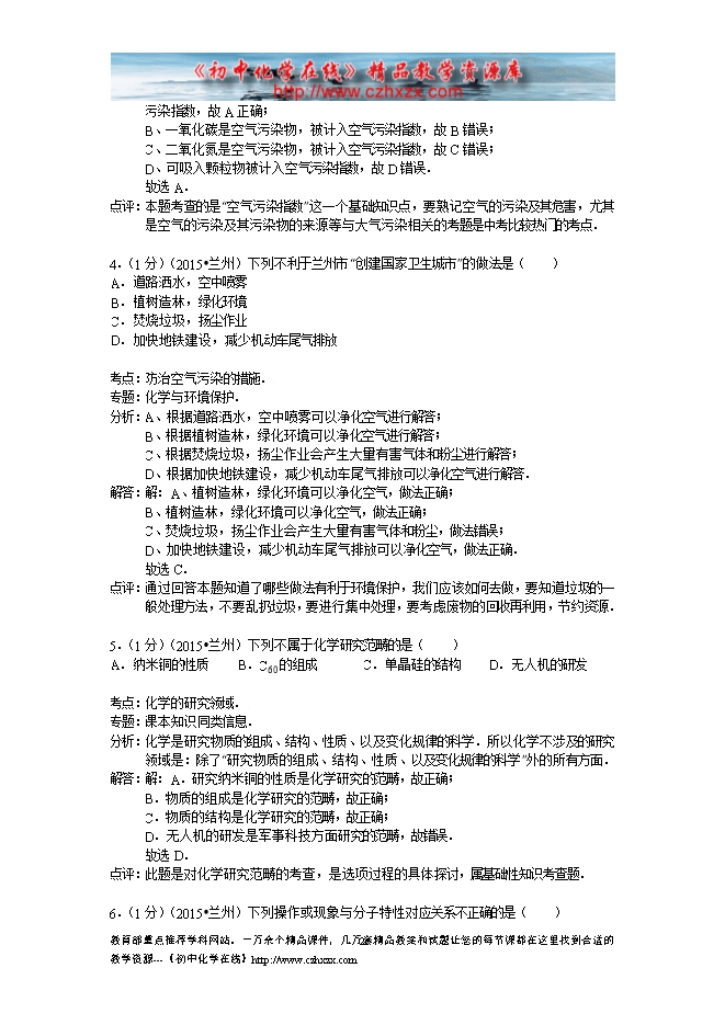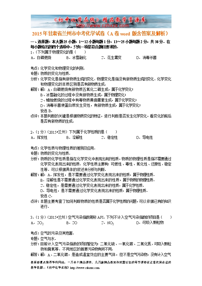 2015年甘肃省兰州市中考化学试卷(A卷,word版含答案及解析)