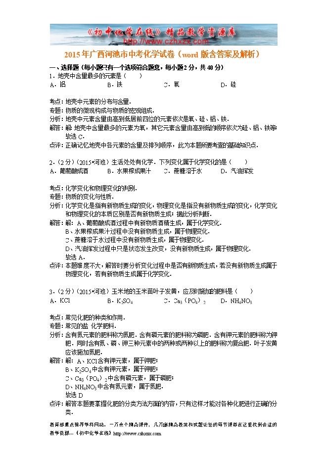 2015年广西河池市中考化学试卷(word版含答案及解析)