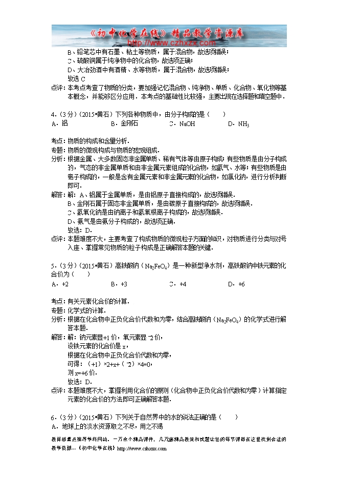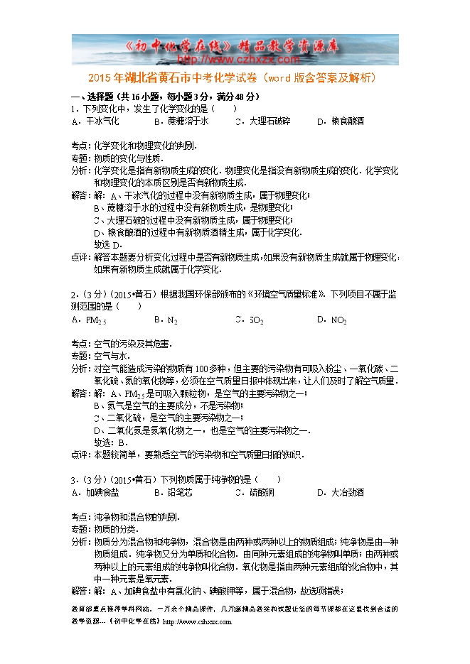 2015年湖北省黄石市中考化学试卷(word版含答案及解析)
