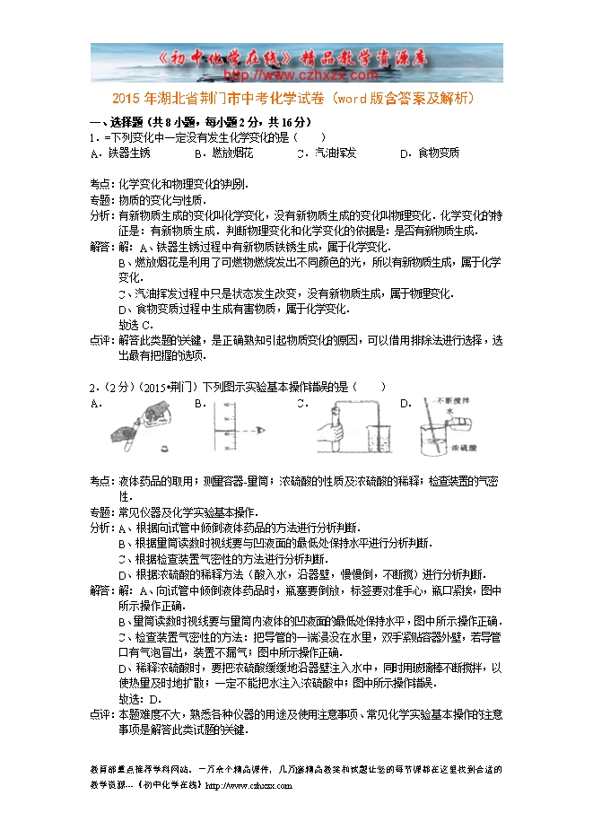2015年湖北省荆门市中考化学试卷(word版含答案及解析)