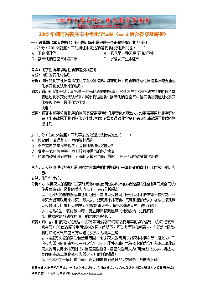 2015年湖南省娄底市中考化学试卷(word版含答案及解析)
