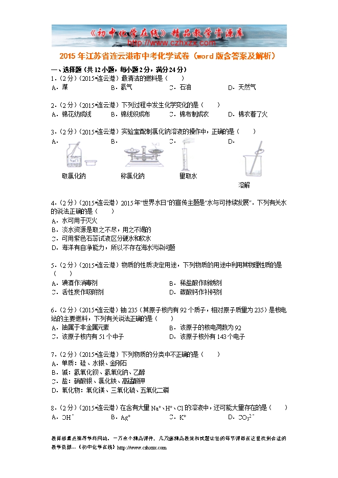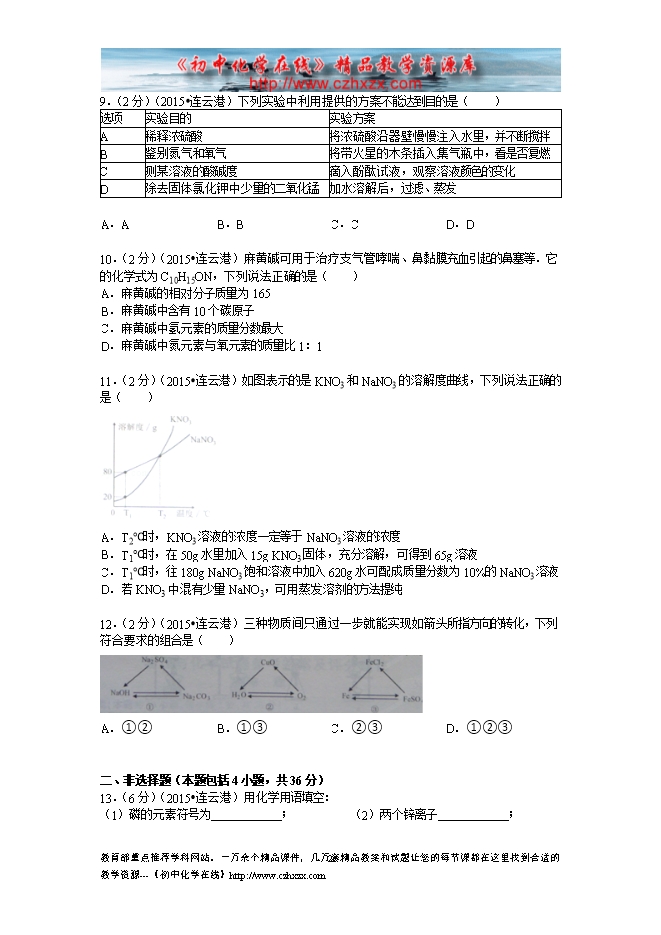 2015年江苏省连云港市中考化学试卷(word版含答案及解析)