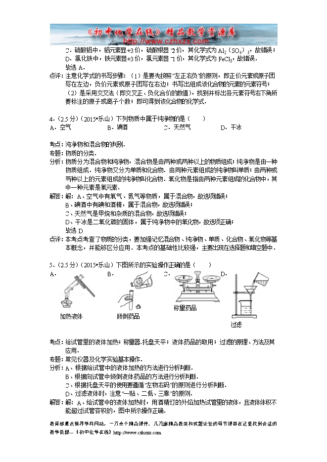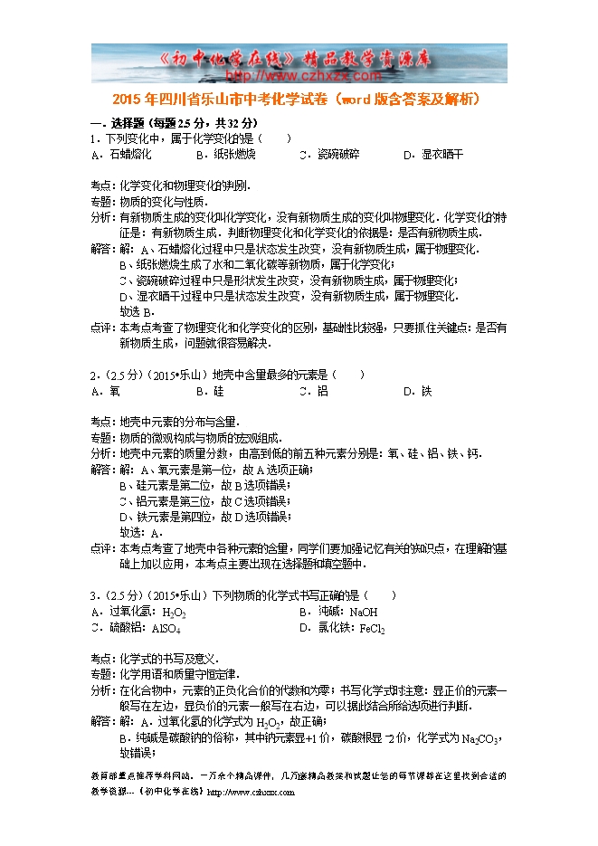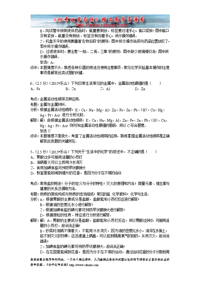 2015年四川省乐山市中考化学试卷(word版含答案及解析)