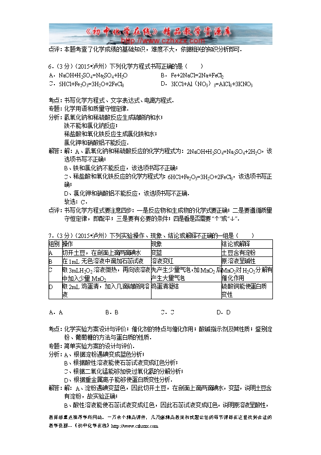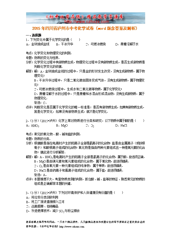 2015年四川省泸州市中考化学试卷(word版含答案及解析)