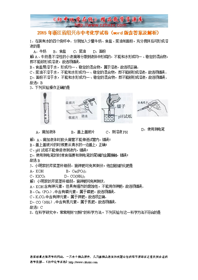 2015年浙江省绍兴市中考化学试卷(word版含答案及解析)