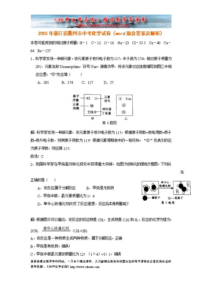 2015年浙江省衢州市中考化学试卷(word版含答案及解析)