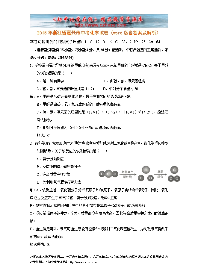 2015年浙江省嘉兴市中考化学试卷(word版含答案及解析)