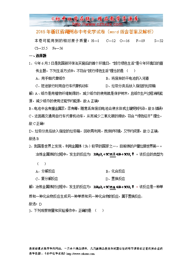 2015年浙江省湖州市中考化学试卷(word版含答案及解析)