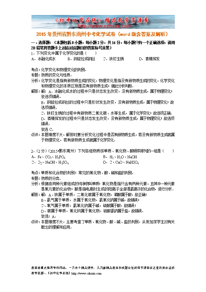 2015年贵州省黔东南州中考化学试卷(word版含答案及解析)
